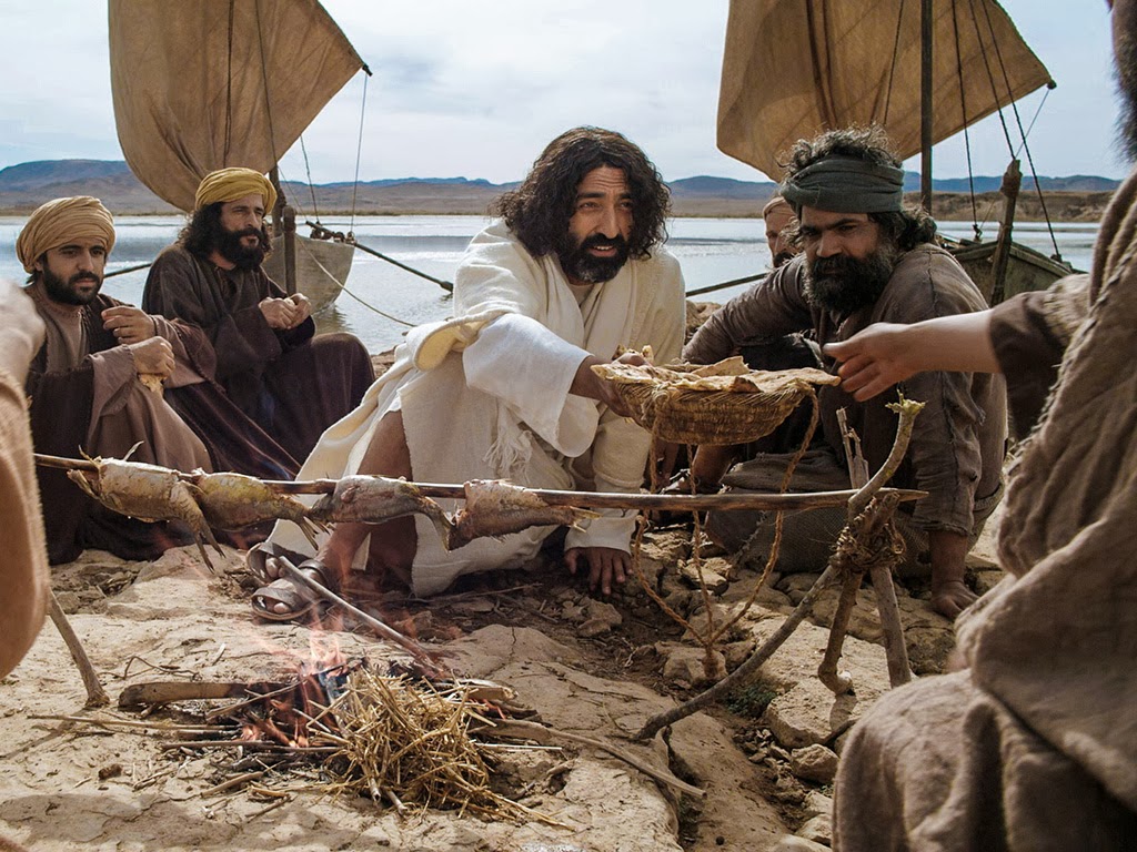 Then, they see a figure of Someone standing on the beach who calls to them and says, “Children, you don’t have any fish do you? “No.”